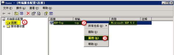 6、在“終端服務(wù)配置\連接”的窗口中,終端服務(wù)配置 – “RDP-Tcp” – 屬性。