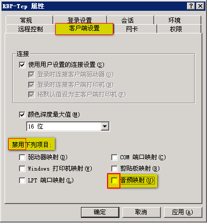7、允許“音頻映射”。步驟:“客戶端設(shè)置”頁簽 - 禁用下列項(xiàng)目 – 去除“音頻映射” – 應(yīng)用 – 確定。