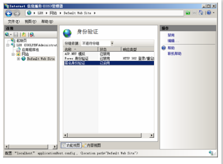第二步,在站點主頁窗口中,選擇“身份驗證”,雙擊,顯示“身份驗證”窗口。默認情況下,“匿名身份驗證”為“啟用”狀態(tài),如下圖所示: