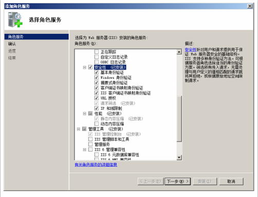 第一步,在“服務器管理器”窗口中,展開“角色”節(jié)點,選擇“Web 服務器(IIS)”,單擊“添加角色服務”,顯示如下圖所示的“選擇角色服務”窗口。在“安全性”選項區(qū)域中,可選擇欲安裝的身份驗證方式。