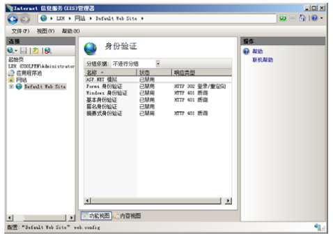 第二步,安裝完成后,打開 IIS 管理器,再打開“身份驗證”窗口,所經安裝的身份驗證方式顯示在列表中,并且默認均為禁用狀態(tài),如下圖所示。