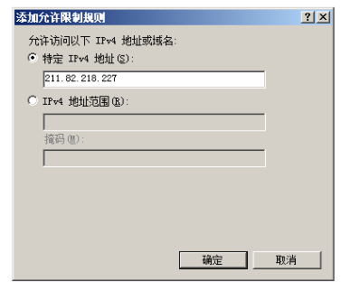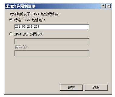 第二步,在右側“操作”任務欄中,單擊“添加允許條目”鏈接,顯示如下圖所示的“添加允許限制規(guī)則”窗口。如果要添加一個 IP 地址,可點選“特定 IPv4 地址”單選按鈕,并輸入允許訪問的 IP 地址即可;如果要添加一個 IP 地址段,可點選“IPv4 地址范圍”單選按鈕,并輸入 IP 地址及子網掩碼即可。