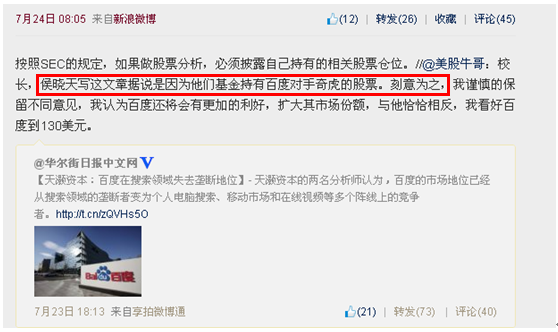 看完我一直不明白候小天為什么這么寫,憑他們的水平應該不會把問題看得這么片面扭曲吧,后來看了微博上@安普若-安校長的微博,就是上面的截圖,什么都明白了:原來人家持有奇虎的股份呀,怪不得要絞盡腦汗來唱衰百度,可以理解,利益至上嘛。