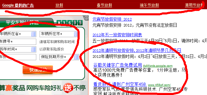 網站第一版大部分是廣告,真正給用戶看的內容就是那三條放假安排的文章鏈接。上面是谷歌聯盟的文字廣告,左邊的百度聯盟的圖片廣告,右邊是谷歌經典 廣告,三個廣告中間夾著的就是用戶搜索的內容了。可以看出谷歌文字廣告匹配得非常精確,所以那段廣告肯定也是點擊率最高的,谷歌經典點擊率第二,百度圖片 第三,另外網站還有兩次彈窗。