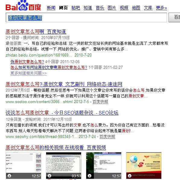 下面給大家舉例說明一下吧,假若你寫的一篇文章是關于原創(chuàng)文章怎么寫的話,那么你寫的文章被收錄幾率到底高還是低?首先,我們通過百度搜索引擎搜索:原創(chuàng)文章怎么寫