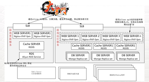 2、在關(guān)鍵路徑上,部署主備集群,通過負載均衡服務(wù)SLB分發(fā)并對外提供服務(wù),避免單點故障帶來的游戲不可用。游戲更新和運行服務(wù)均體現(xiàn)了這一點。