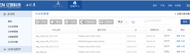 下面是云主機(jī)后臺(tái)管理,主機(jī)操作、性能監(jiān)控比較簡(jiǎn)潔,回想起以前用過一家虛擬主機(jī),名字就不說了,我們都知道虛擬主機(jī)都有CPU使用率的限制的,筆者僅僅是一個(gè)個(gè)人博客,可是無緣無故不能訪問了好幾次,打電話問他們客服,說經(jīng)過技術(shù)排查,說是我CPU超限了,MY GOD!我一個(gè)只有幾千瀏覽量的個(gè)人博客CPU超限?我恨不得跳起來問候他們家長(zhǎng),你們的節(jié)操呢?