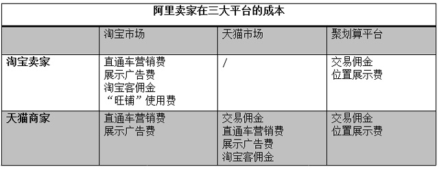 C2C業(yè)務(wù),即淘寶,收入主要來自于賣家的營(yíng)銷費(fèi)用;B2C業(yè)務(wù)中,天貓主要靠交易額傭金收錢,而聚劃算的收入主要來自賣家的展示廣告位置費(fèi)。下圖中可以清楚的看出,淘寶和天貓賣家在阿里不同平臺(tái)上做生意,都需要支出哪些成本:
