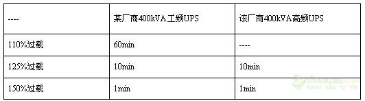 第一,過載能力強,抗負載沖擊能力強。過載能力是IEC62040-3中要求標稱的關鍵指標之一,其強弱可通過實際數據來衡量。表-1所示為同一廠商的工頻機與高頻機過載能力,由表-1可知,兩類機型過載能力并沒有區別。