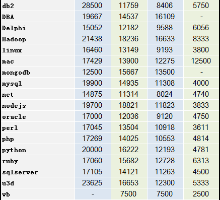 在應屆生中,薪資水平最高的職位依次有:架構師、mac、hadoop、技術經理以及算法。最低的有vb、自動化測試、廣告算法。