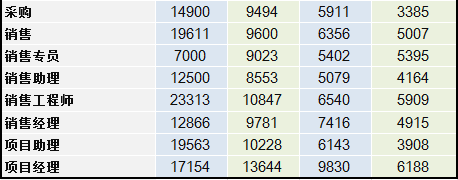在職能類職位整體數據中,最令人吃驚的還是前臺的工資……5年-10年工作經驗,居然能拿到高達33000元的月薪!居然比行政總監和HRD還高……難道做前臺5年后都升職變成老板娘了嗎(……這個,經過查證,是某些公司把前端職位當成了前臺了-。-……)