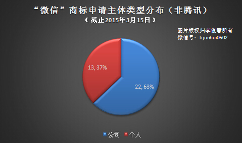 商標局網站(中國商標網)查詢結果顯示,截止2015年3月15日,累計已有81件“微信”商標注冊申請,申請主體除去騰訊外,還涉及22家公司和13位個人。