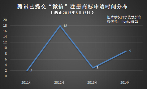 騰訊2011年1月最早提交的商標注冊申請僅涉及兩個類別,即計算機相關(9類)和電視相關(38類)。騰訊開始大量注冊外圍或周邊應用等商品或服務類別,加固“微信”商標防火墻的時間發生在2012年。當年騰訊一口氣新提交了18件“微信”圖文商標申請,并于當年的6月27日、28日、29日三天集中完成注冊申請提交。