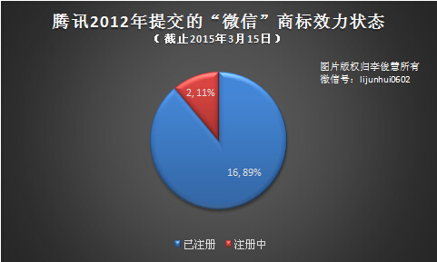 從商標效力狀態看,截止2015年3月15日,騰訊2012年提交的18件“微信”注冊商標,已有16件完成注冊,另有2件依舊處于“注冊中”狀態,分別為38類和43類。