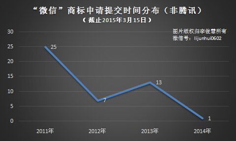 從申請時間來看,非騰訊公司提交的“微信”商標注冊申請,集中發生在兩個年份2011年和2013年。簡單說,在微信面世第一個年頭,微信在騰訊內部的地位處于由“邊緣向核心”過渡階段,騰訊自身并未在此階段啟動“微信”商標周邊類別或跨類別保護注冊。但是,微信的用戶,顯然比騰訊更敏銳,一些公司或個人在此期間陸續提交了25件“微信”商標申請。