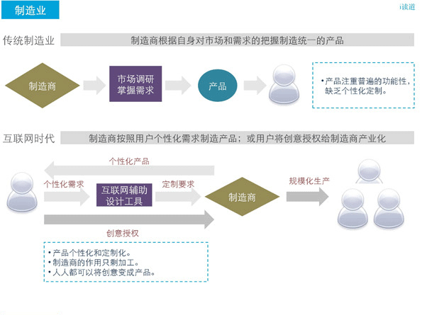 傳統(tǒng)的制造業(yè)都是封閉式生產(chǎn),由生產(chǎn)商決定生產(chǎn)何種商品。生產(chǎn)者與消費者的角色是割裂的。但是在未來,互聯(lián)網(wǎng)會瓦解這種狀態(tài),未來將會由顧客全程參與到生產(chǎn)環(huán)節(jié)當中,有用戶共同決策來制造他們想要的產(chǎn)品。也就是說,未來時代消費者與生產(chǎn)者的界限會模糊起來,而同時傳統(tǒng)的經(jīng)濟理論面臨崩潰。這也是注定要誕生的C2B全新模式。