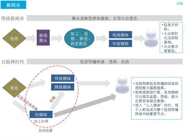 傳統(tǒng)新聞業(yè)被寡頭壟斷,在這樣一種壟斷之下,實際上是在壟斷真相。自媒體,以及小微媒體可以說是隨著互聯(lián)網(wǎng)發(fā)展進程的必然產(chǎn)物。互聯(lián)網(wǎng)進化最大的特點就是,透明!透明!再透明!福柯說過話語的本質(zhì)就是權力意志,如果說新聞業(yè)是話語霸權的主導者,那么自媒體就是對話語霸權的解構(gòu),使得話語權力回歸到每一個有話語權的言說者身上。