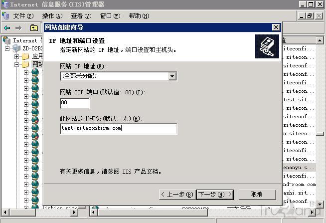 4、這里是比較關(guān)鍵的一步,IP地址一般設(shè)置“全部未分配”,這樣有個好處:萬一主機變動了IP,你不需要去IIS里面設(shè)置,只需要修改下域名解析就可以了。當(dāng)然,如果你有多個IP,也可以為不同的網(wǎng)站指定不同的IP。端口一般為80,Web服務(wù)標(biāo)準(zhǔn)端口。主機頭那里寫你網(wǎng)站的域名,繼續(xù),下一步