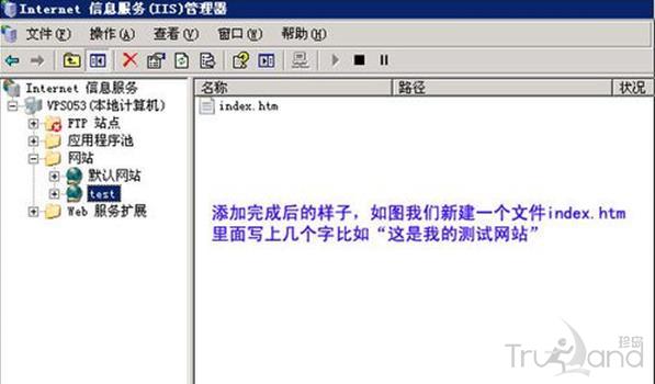 7、添加完成后,我們在E:\wwwroot 創(chuàng)建一個文件index.htm 用記事本打開,寫入測試文字。