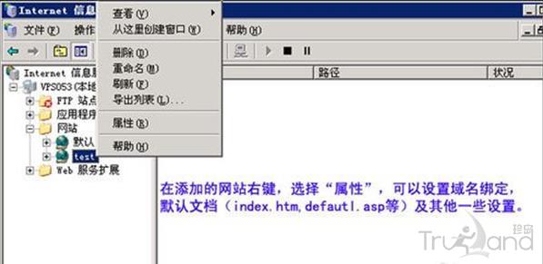 8、添加完成后,可以看到“test” 的網(wǎng)站,如圖。右鍵“屬性”可以綁定域名,設(shè)置默認文檔,404錯誤頁等