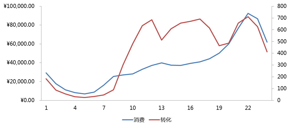 在筆者一位客戶的推廣過程中,筆者通過對不同時段的消費、轉化進行了分析,發現在不同時段中,不同的渠道,網民的行為和流量占比差別是比較大的,這樣的發現也為我們在推廣時間的優化上提供了幫助,如圖1-2、圖1-3。