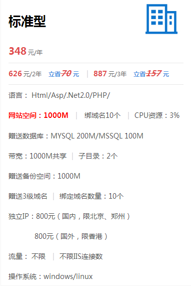 虛擬主機可分為國內虛擬主機、免備案虛擬主機,其中免備案虛擬主機以簡單、方便、快捷更贏得了客戶的喜愛。免備案虛擬主機開通即可使用,不限制IIS流量,讓您的網站更暢通。采用DELL高配服務器,安全穩定。7*24小時全天候客戶服務,更放心。其價格更加優惠,具體如下圖所示: