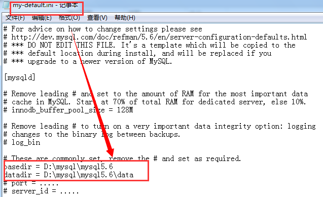 進(jìn)入這個(gè)路徑然后找到my-default.ini,用記事本打開,修改文件中內(nèi)容basedir和datadir的值,主要是填寫安裝的路徑和data保存的路徑,正確填寫如下圖: