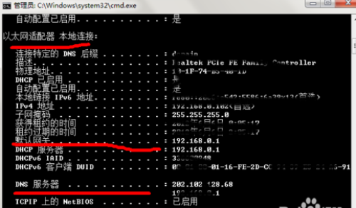 (3)如果(2)沒有問題,那你再輸入ping 你的網關地址,即你的路由器地址或者交換機的網關地址,一般為192.168.0(或者1).1。網關具體獲取方法是在命令行輸入ipconfig/all,然后找到你當前連接網絡類型對應的網關地址,如圖:圖中第二條紅線