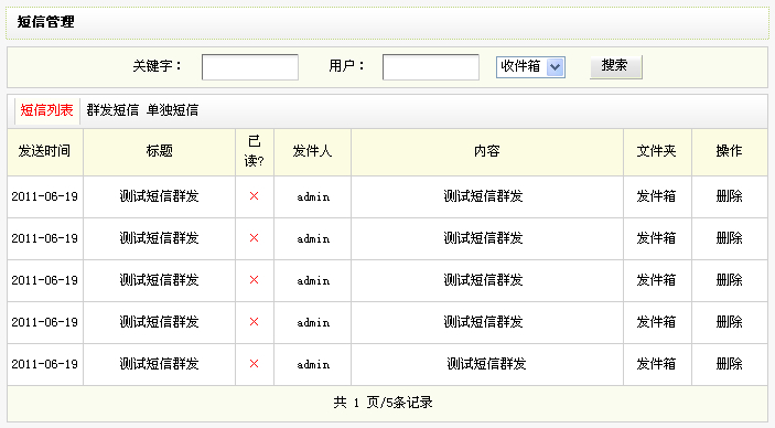 可以輸入關(guān)鍵字、用戶以及選擇收件箱或發(fā)件箱進(jìn)行搜索用戶的短信進(jìn)行查看管理。