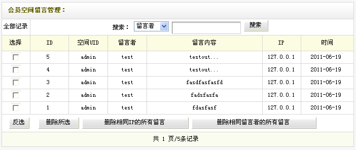 可以在上邊的留言管理中選擇指定的留言,進(jìn)行“刪除所選”、“刪除相同IP的所有留言”和“刪除相同留言者的所有留言”操作。