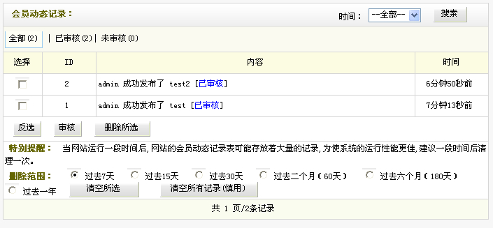 可以勾選指定ID的動(dòng)態(tài)后,點(diǎn)擊“刪除所選”可以進(jìn)行清理指定動(dòng)態(tài)記錄;也可以點(diǎn)擊“審核”將所選動(dòng)態(tài)審核通過(guò)。