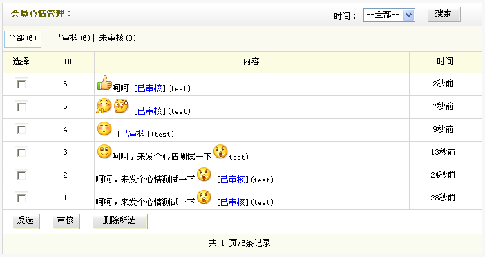 您可以勾選指定心情后,點(diǎn)擊“審核”進(jìn)行通過(guò);也可以點(diǎn)擊“刪除所選”來(lái)進(jìn)行批量清理。