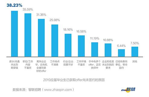 另外,調(diào)研還顯示,簽約率同比小幅上升,關(guān)于尚未簽約的原因,“薪水/待遇未達到期望值”仍是毀約首要因素,比例為38.23%。其次是“職位/工作內(nèi)容不喜歡”和“離畢業(yè)還早,還有機會拿到更好的offer”,占比分別為35.59%和31.36%。