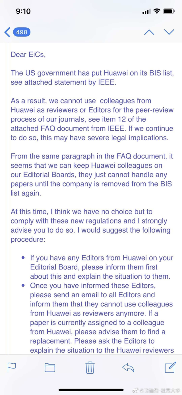 郵件中稱,由于美國商務部將華為列入黑名單,IEEE做出如下聲明: