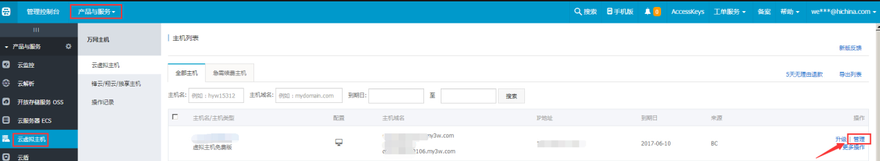 1、登錄云虛擬主機的管理控制臺,在產品管理中找到云虛擬主機,然后就可以執行進一步管理。如下圖:
