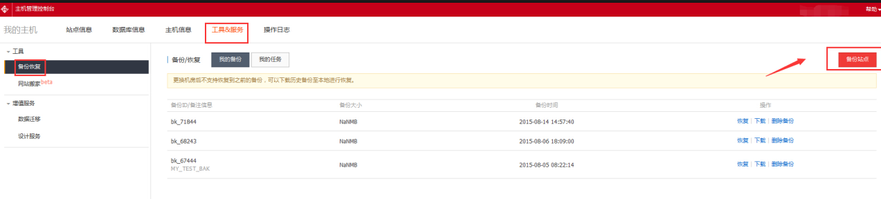 2、在主機管理控制臺——>工具和服務——>備份恢復——>備份站點——>備份數據庫