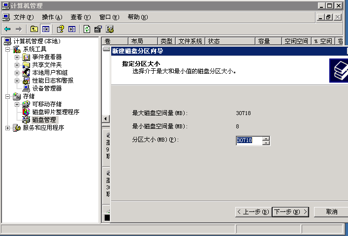 2.選擇磁盤管理,出現(xiàn)下圖,點下一步