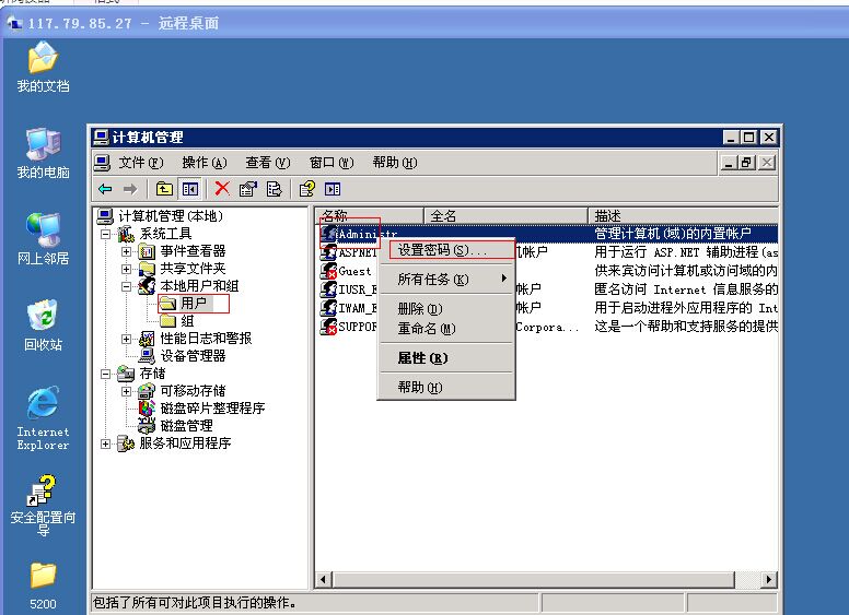 右擊“我的電腦”——選擇“管理”——選擇“本地用戶和組”——單擊“用戶”,右側可以看到默認的系統帳號“Administrator”——右健點擊“設置密碼”來設置您自己的密碼。如圖:
