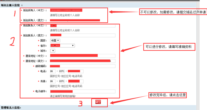 7、請進行修改域名聯系人信息,點擊【確定】完成設置;