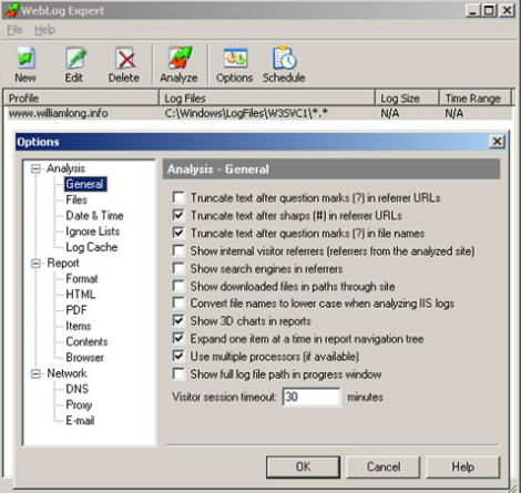 WebLog Expert - 雖然Google Analytics是一款強大的免費的網站分析服務,但必須加入統計代碼才能使用,WebLog Expert則可以直接分析網站的訪問日志文件,通過日志文件分析出網站的站點訪問者、活動統計、文件訪問量、搜索引擎、瀏覽器、操作系統和錯誤頁面等等眾多的統計信息,是網絡監測的好助手。這個軟件本身不免費,不過其另一個版本WebLog Expert Lite是免費的。
