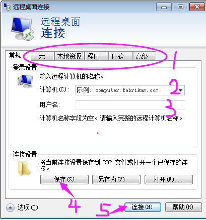 第四步:在伸展的“遠程桌面連接”的“常規”按鈕中依次輸入——計算機(填寫你購買VM時系統給你郵箱發送的IP地址,其中還包括用戶名和密碼) 》 用戶名 》 保存 ,在連接之前,你也可以根據個人需要更改顯示、本地資源、程序、體驗、高級按鈕等選項,最后點擊“連接”按鈕;